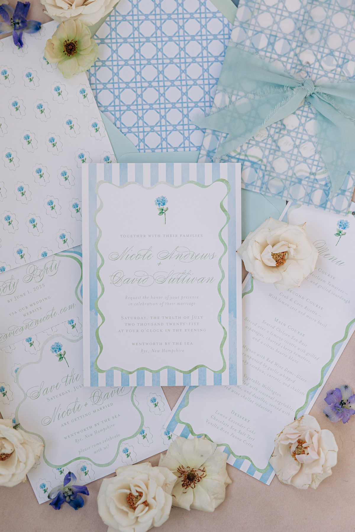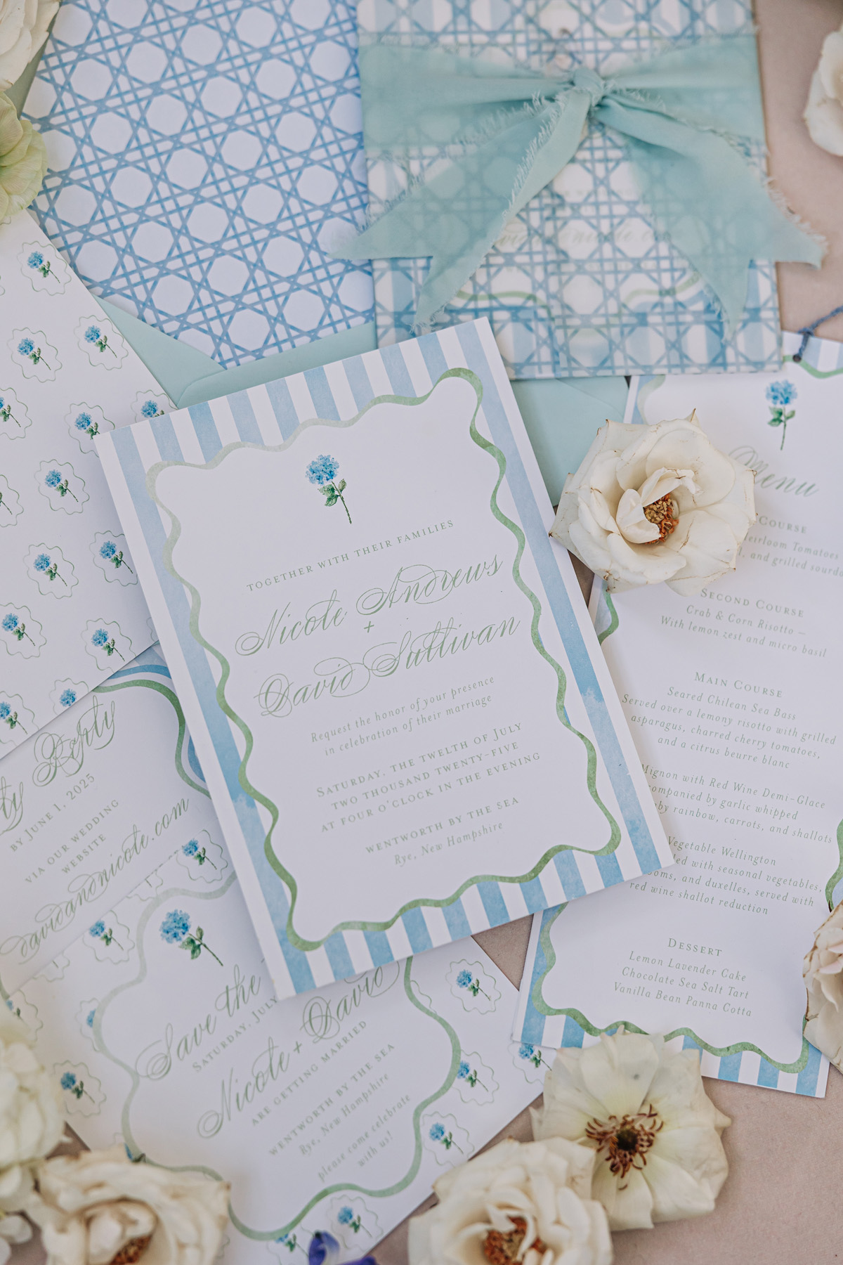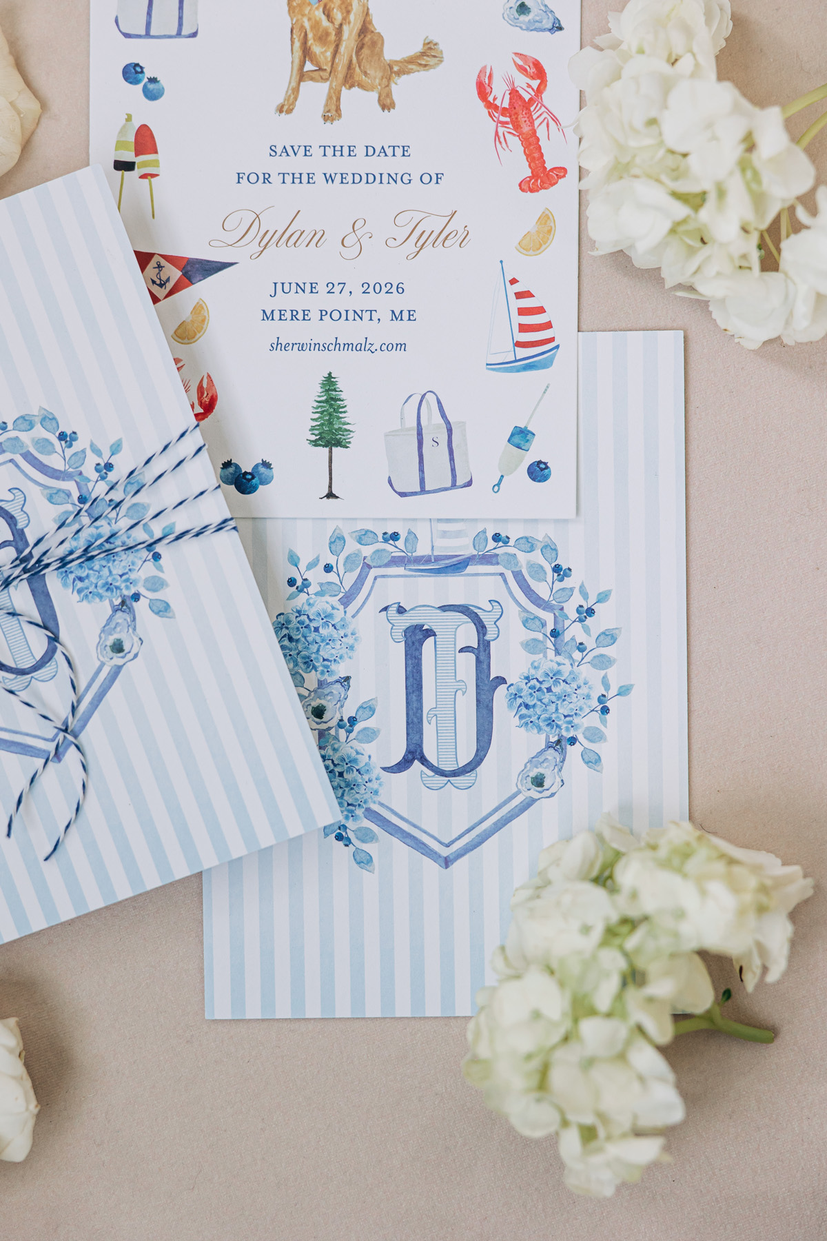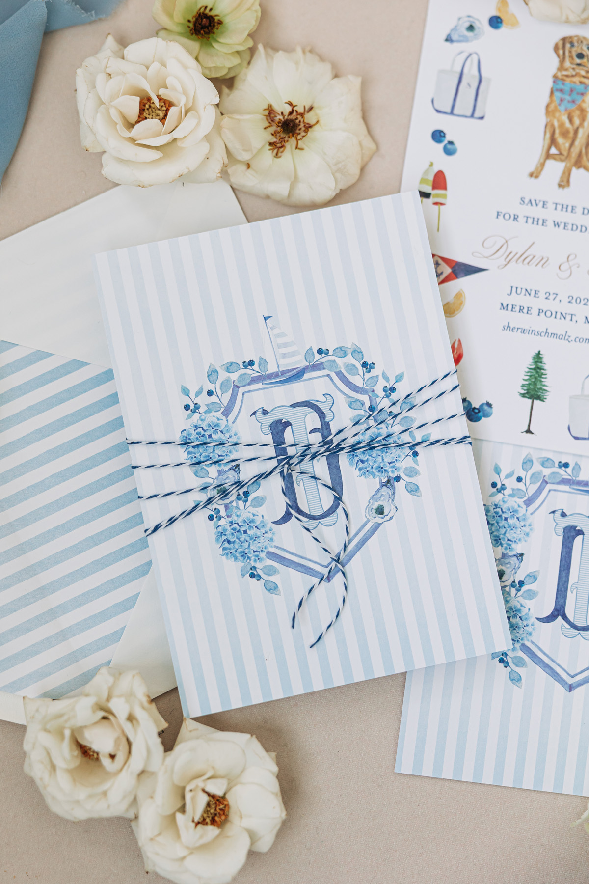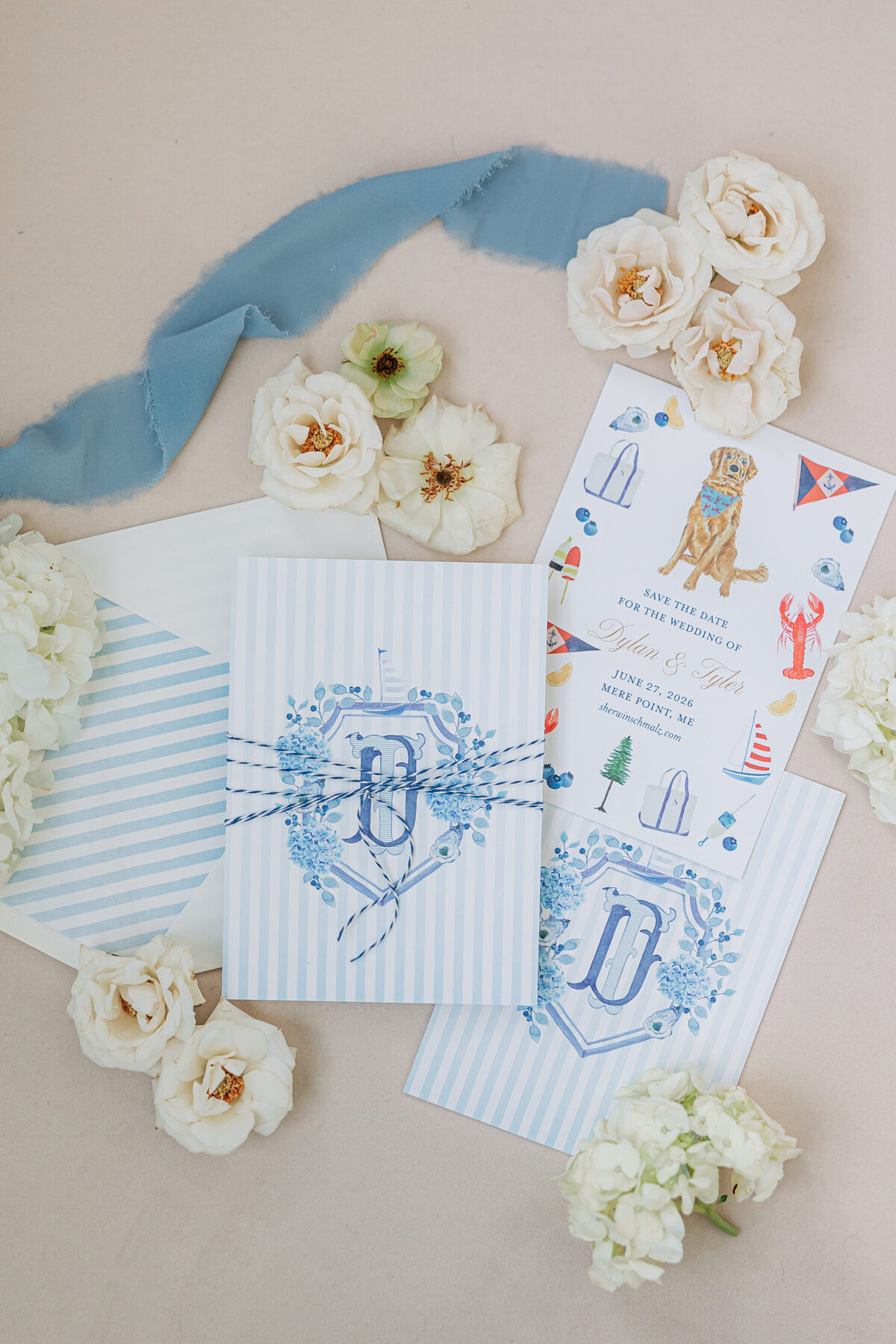 Inspired by seaside elegance and coastal details, this suite brings soft blues and nautical flourishes together for a relaxed yet refined celebration. A custom golden retriever watercolor illustration adds personality and charm to this seaside stationery story.