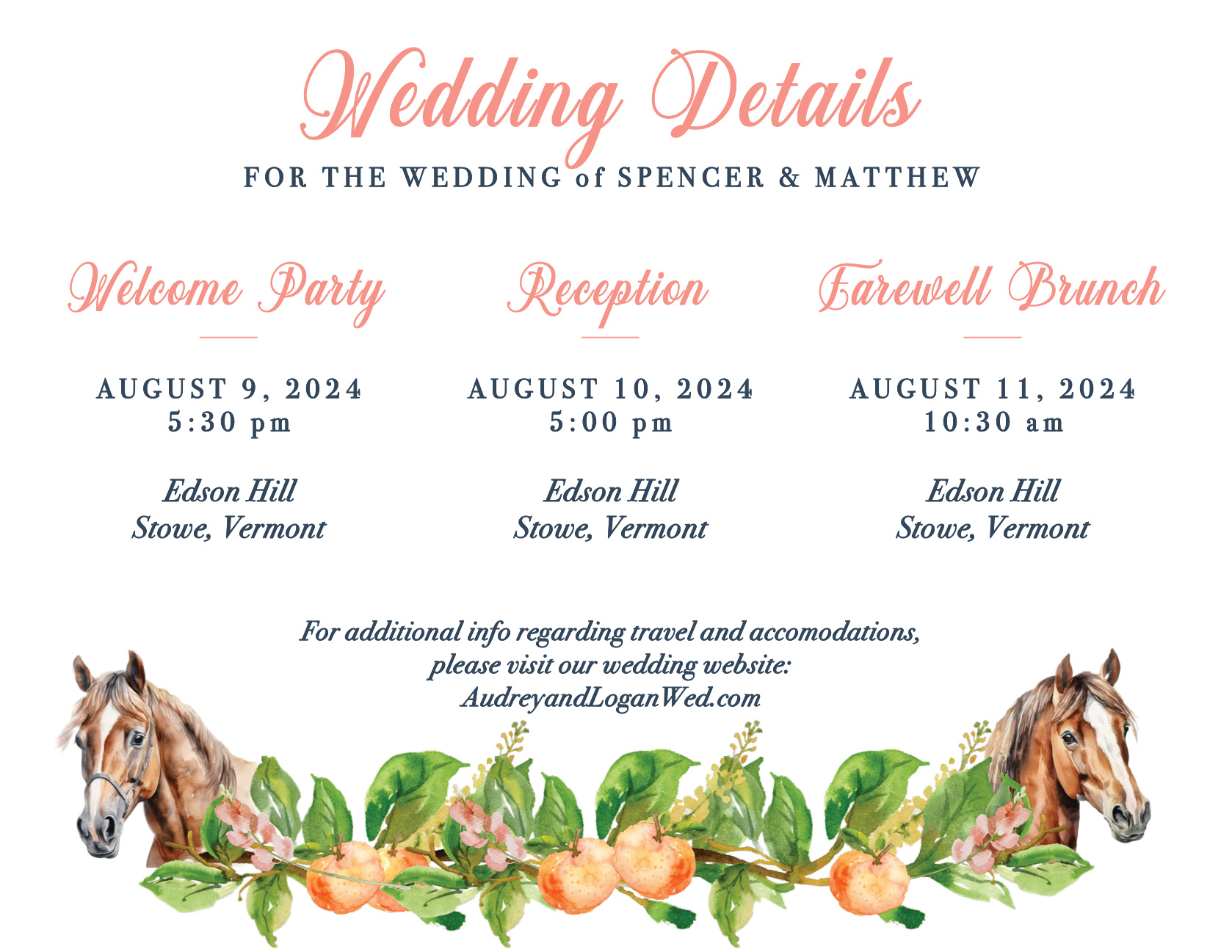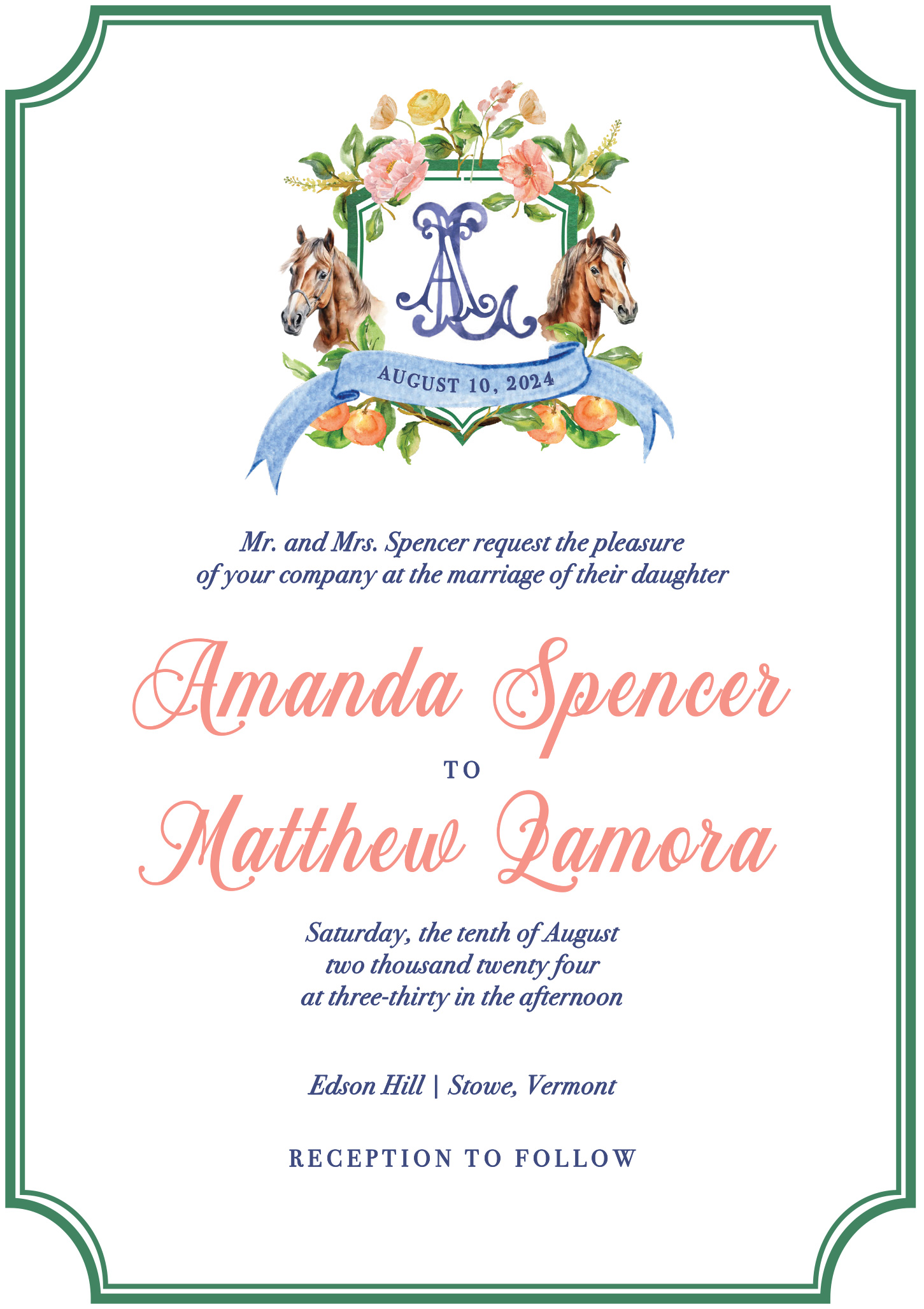 Amanda and Matthew’s wedding invitation suite is a perfect example of Stowe VT invitation design, beautifully capturing their passion for horses with an equestrian theme. This design not only reflects their love for equestrian pursuits but also seamlessly complements their wedding venue at Edson Hill in Stowe, Vermont.