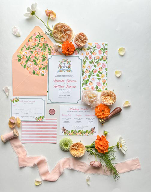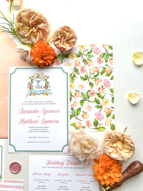 Amanda and Matthew’s wedding invitation suite exemplifies how Stowe VT invitation design can merge personal themes with elegant aesthetics. The equestrian elements and floral details come together to create an invitation suite that perfectly complements their wedding venue and celebrates their special day in Stowe, Vermont.