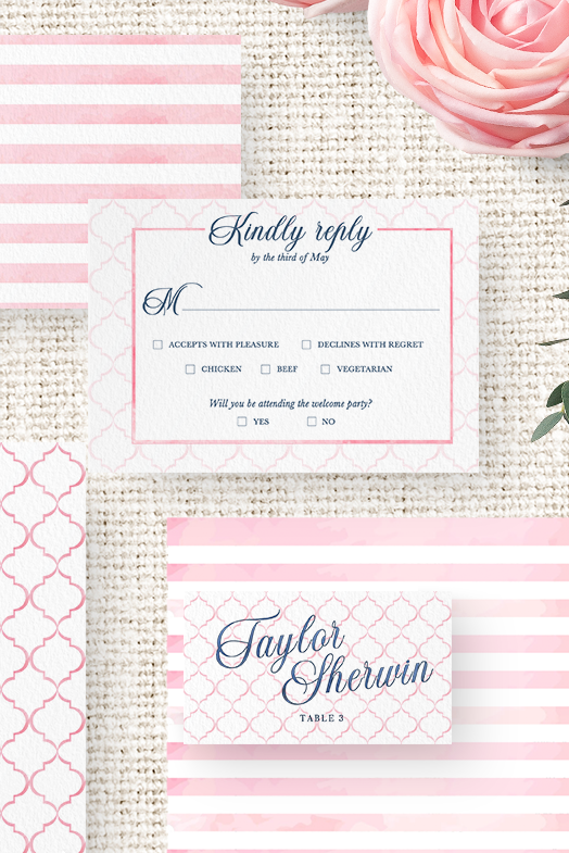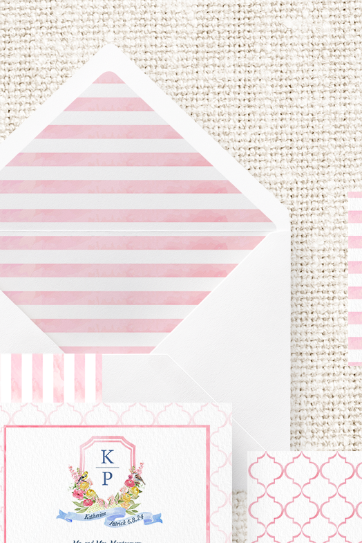 The use of pink watercolor stripes adds a soft and romantic touch, while the garden birds bring a sense of whimsy and nature to the design. This combination is thoughtfully chosen to reflect the beauty of their wedding setting in Stowe, Vermont. The quatrefoil design introduces a classic and refined element, making the suite both contemporary and timeless.