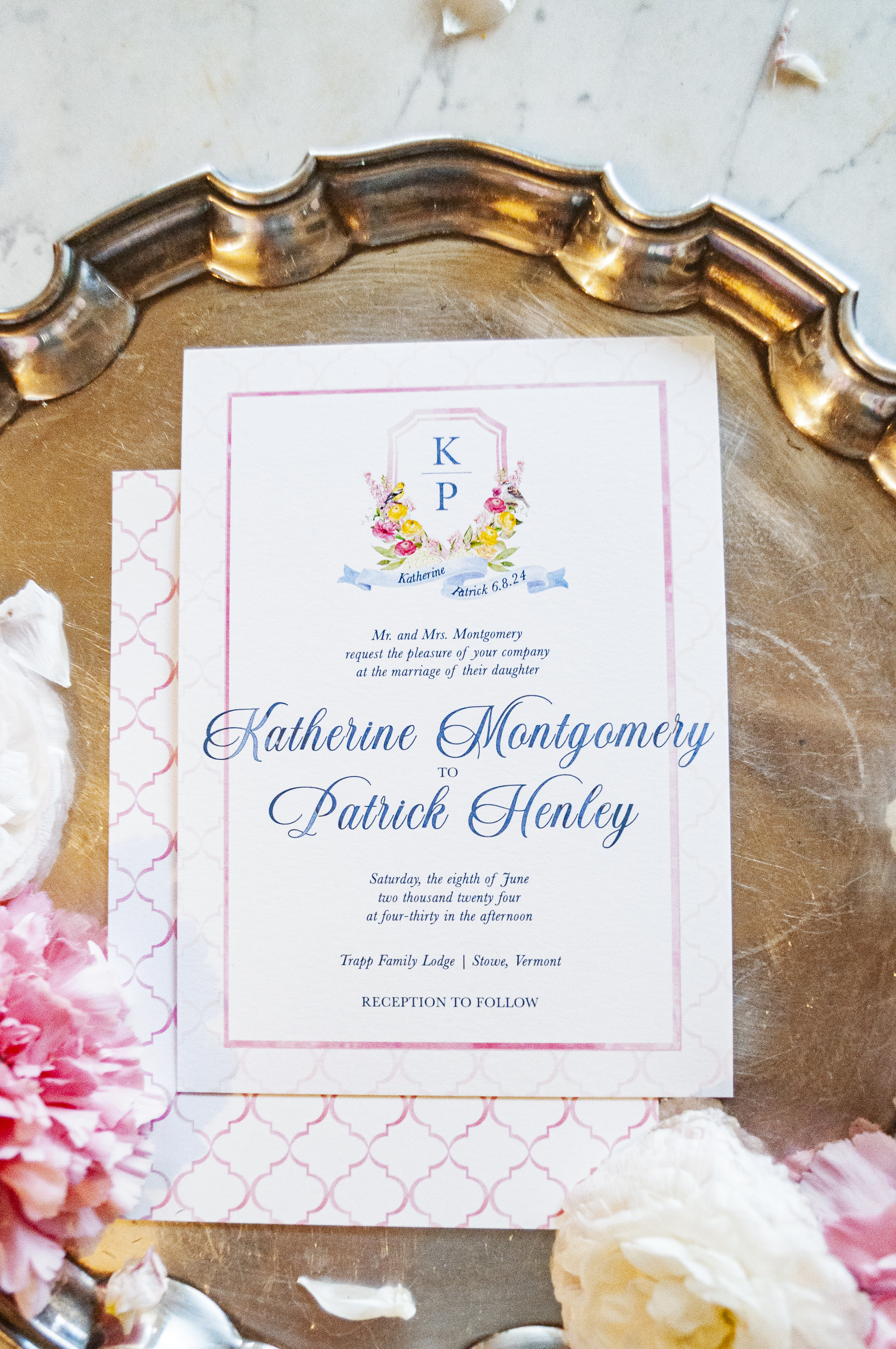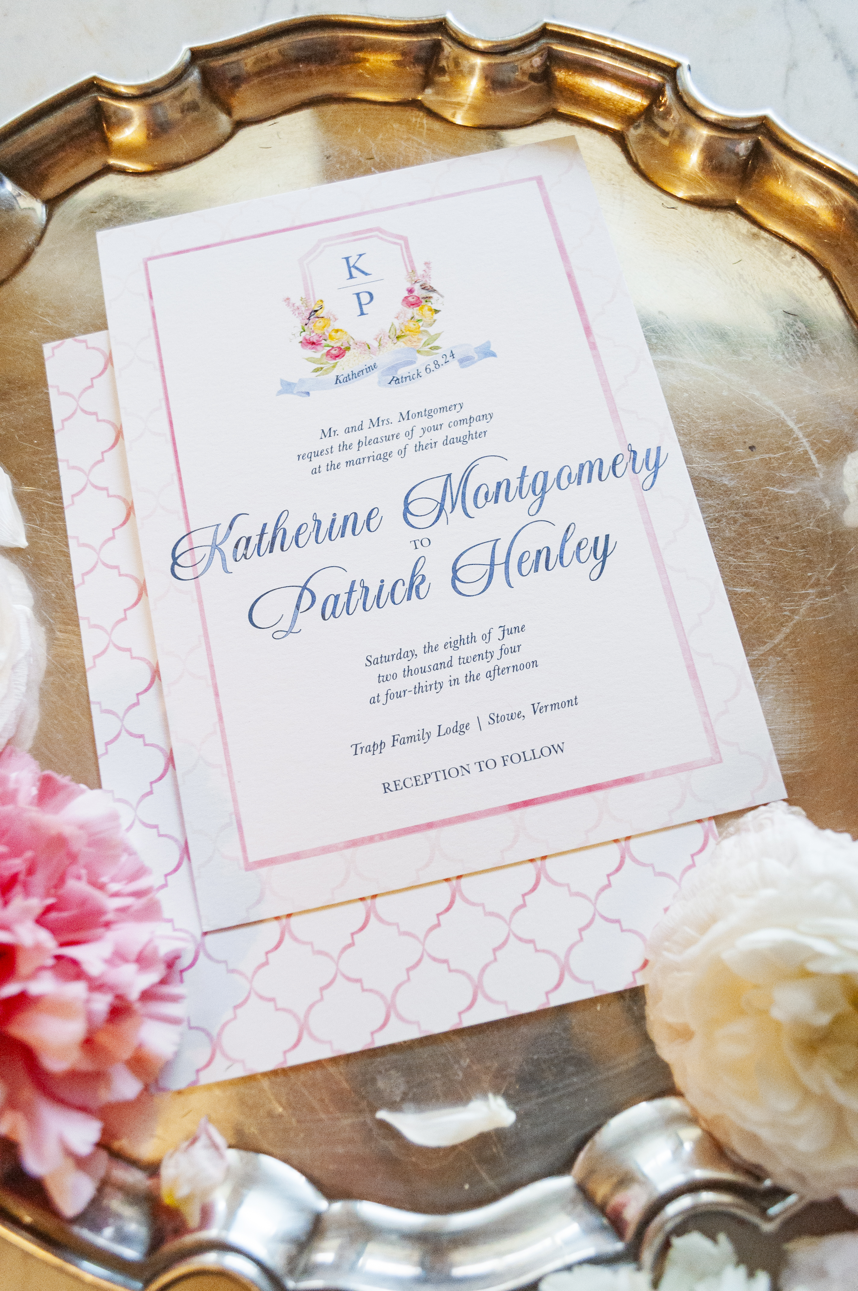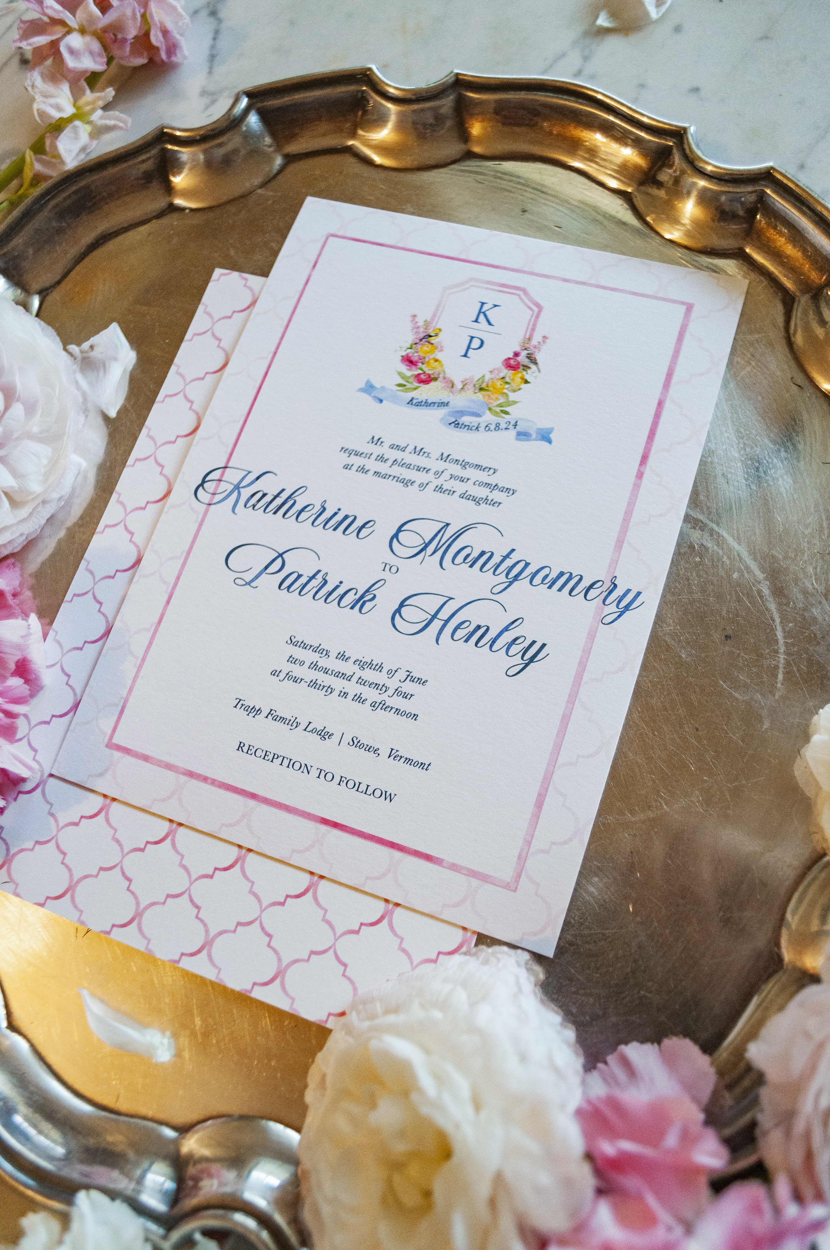 Katherine and Patrick’s wedding in Stowe, Vermont, features truly unique wedding invitations Vermont that are nothing short of stunning. These invitations are a perfect blend of elegance and personal touches, capturing the essence of their special day with a design that stands out. Featuring delicate hints of garden birds, vibrant pink watercolor stripes, and an intricate quatrefoil pattern, this unique wedding invitation suite embodies both charm and sophistication.
